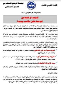 وبهذه المناسبة، فإن الجامعة الوطنية لمستخدمي الضمان الاجتماعي، إذ تهنئ عموم المستخدمات والمستخدمين على تحقيق هذه المكتسبات، فإنها:
